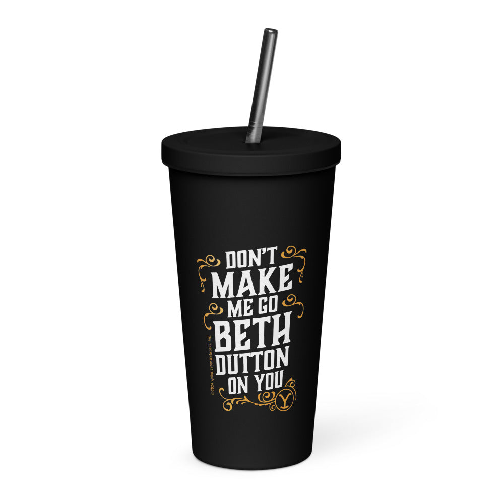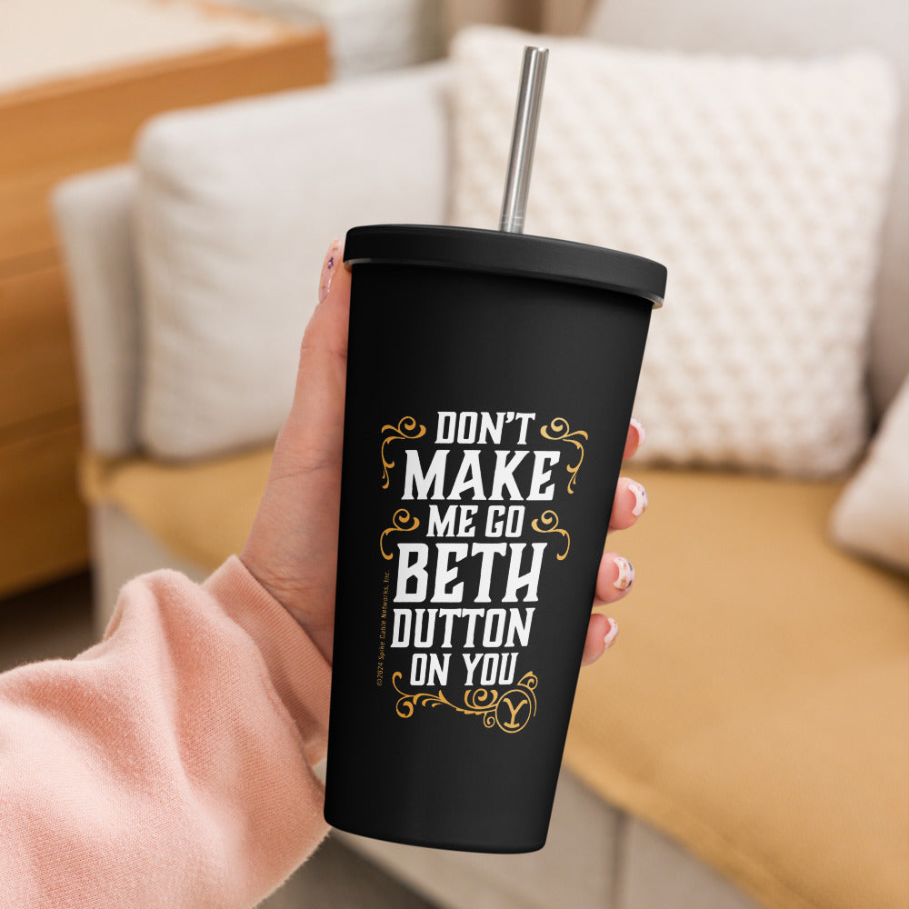 Embrace your inner Beth Dutton with the Yellowstone Don't Make Me Go Beth Dutton On You Tumbler. This stainless steel tumbler, featuring the bold "Don't Make Me Go Beth Dutton On You" design, keeps your beverages hot or cold for hours with its double-wall vacuum insulation. Perfect for fans of Yellowstone, it boasts a spill-resistant lid and durable construction, making it the ultimate companion for work, travel, or wherever your day takes you. Show off your Yellowstone pride and channel your Beth Dutton energy in style!