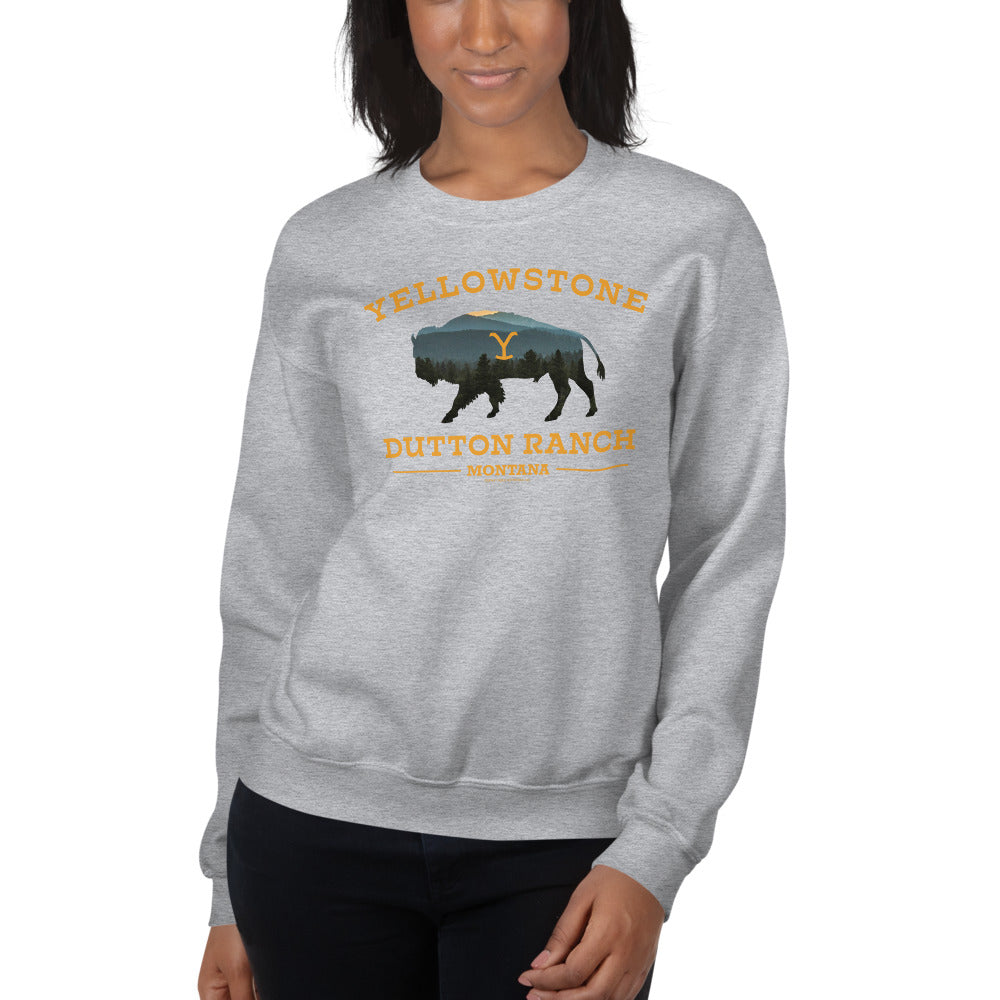 You will feel like an official ranch hand when you wear this Yellowstone Dutton Ranch Bison Unisex Crew Neck Sweatshirt. With a cozy fit for your Yellowstone marathons, this Dutton Ranch sweatshirt is perfect for any fan of the series.