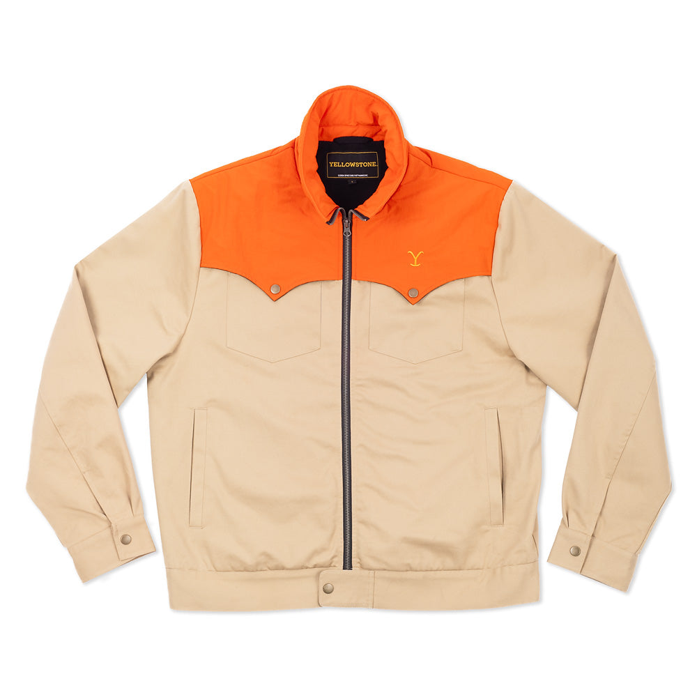 This robust outerwear piece features a distinctive colorblock panel design, instantly recognizable to fans of the show. The embroidered 'Y' emblem proudly displayed on the jacket serves as a subtle nod to the Yellowstone ranch, adding an authentic touch to your ensemble.