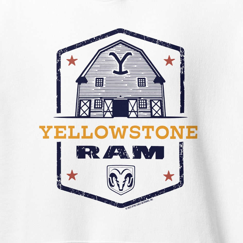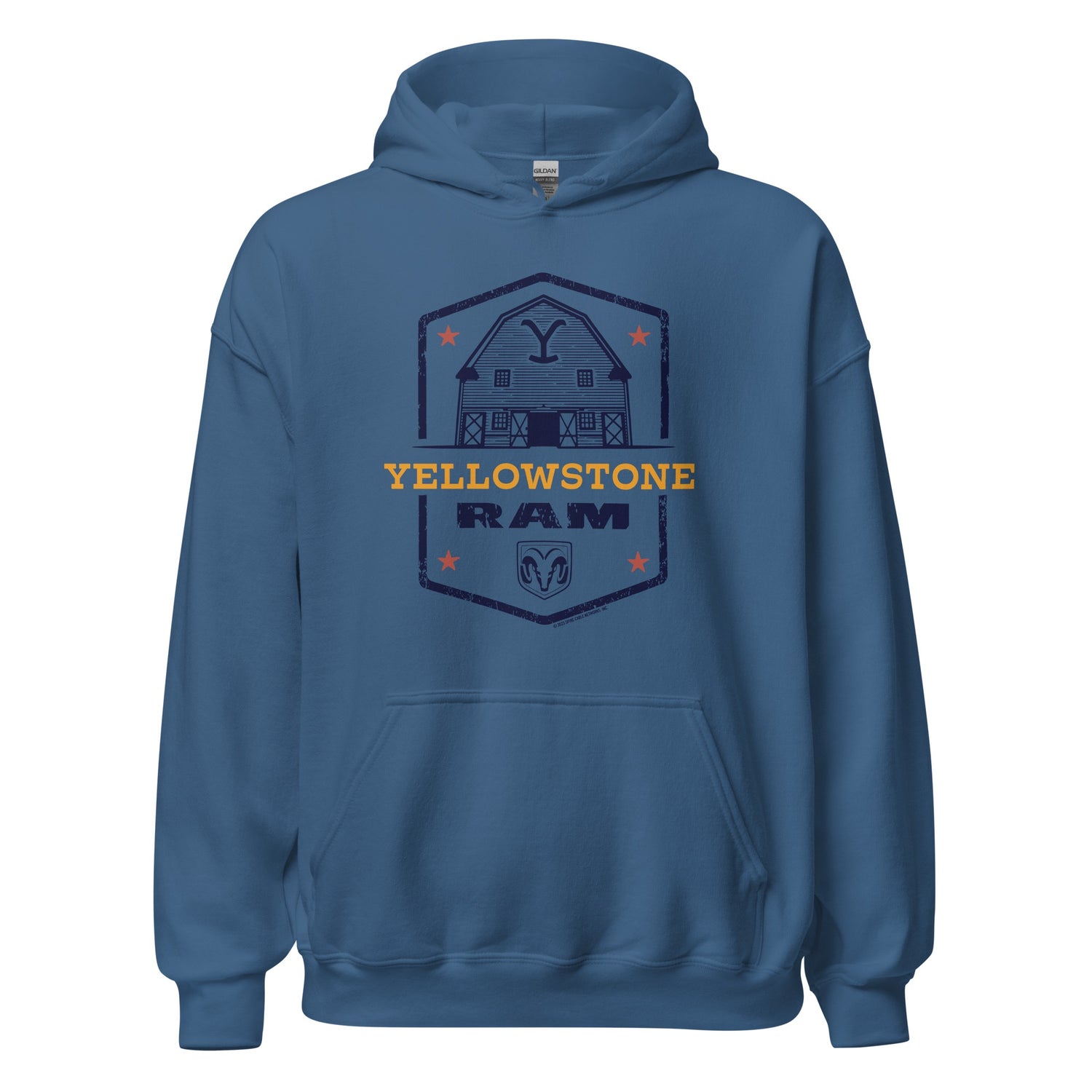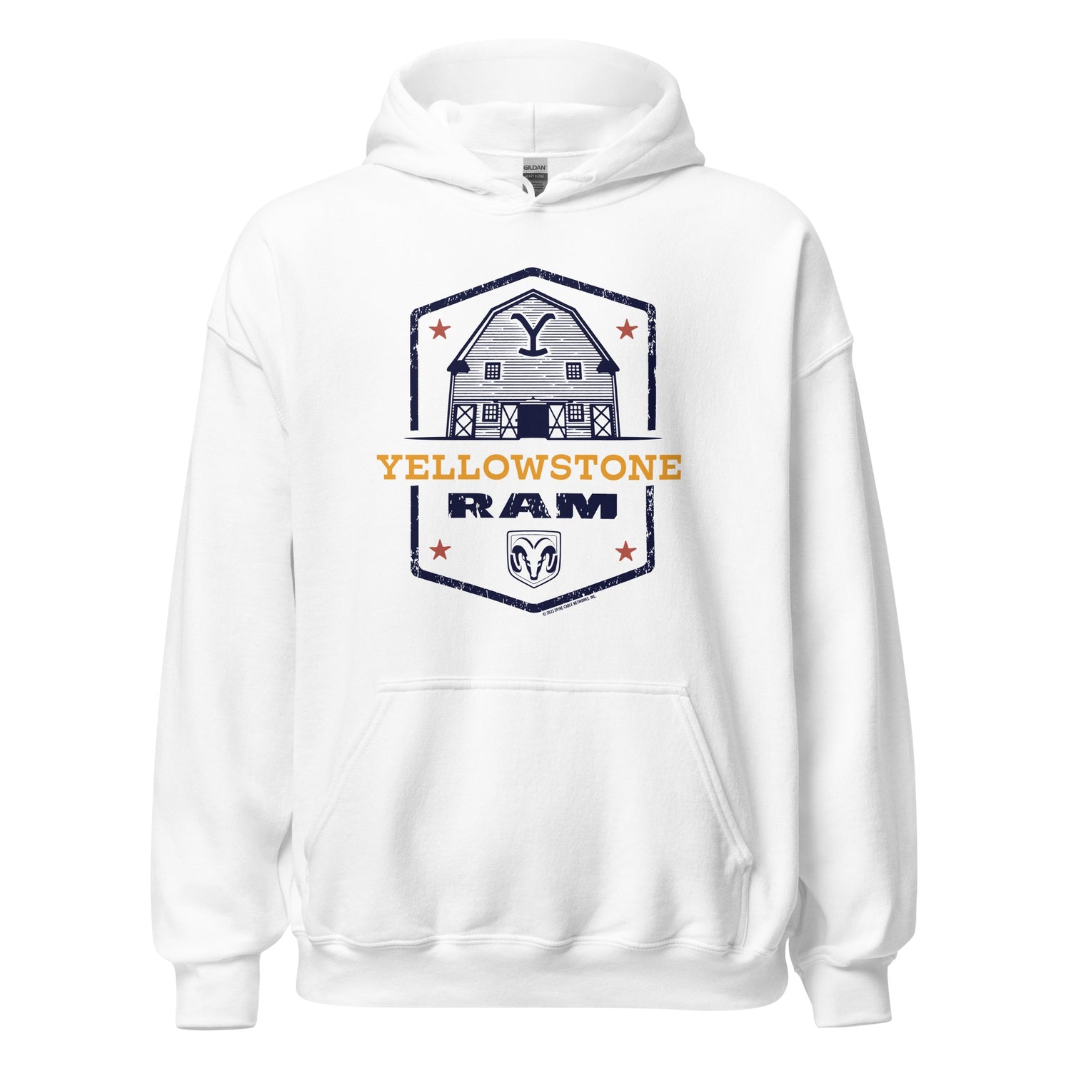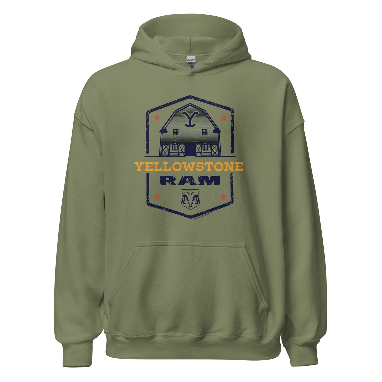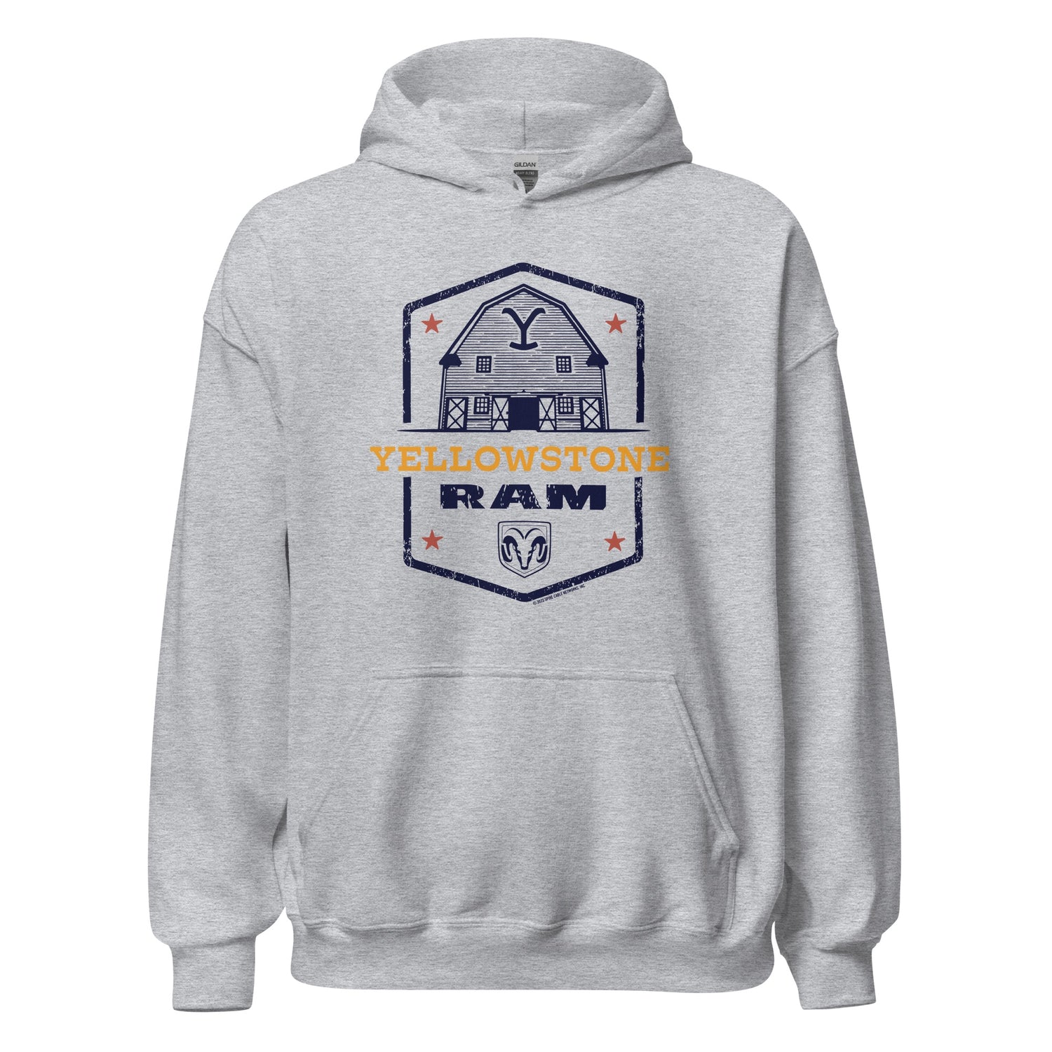 The ultimate combination of ruggedness and nature with the Yellowstone x Ram Trucks Barn Hoodie. This classic hoodie features a rustic barn graphic, adorned with the iconic logos of both Yellowstone and Ram Trucks.