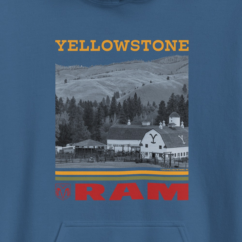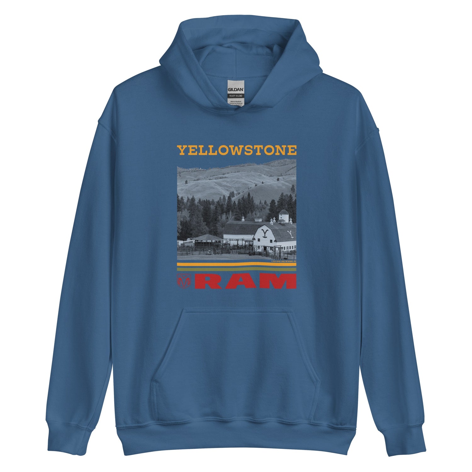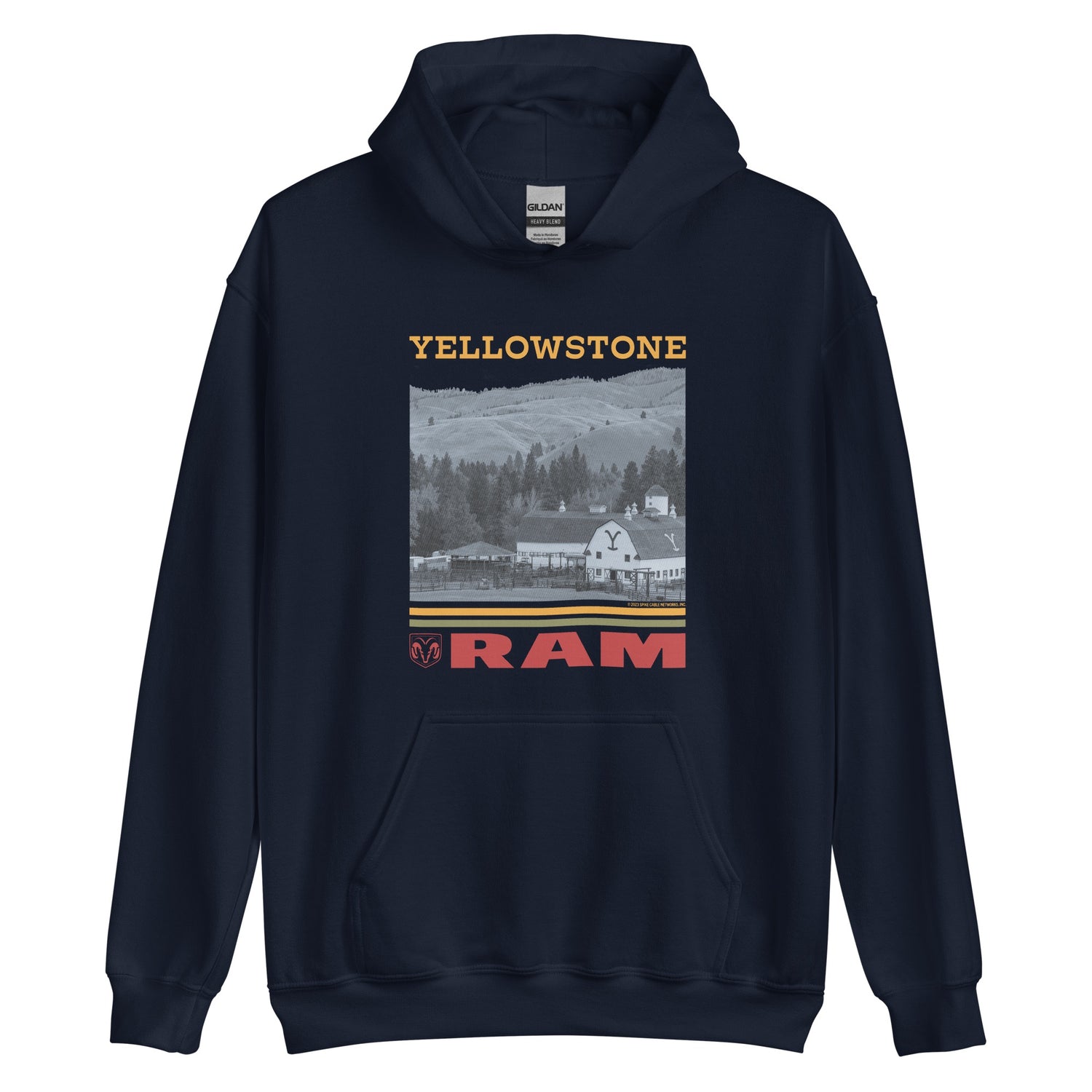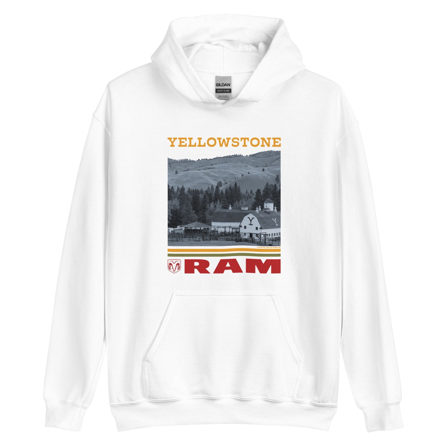 Checkout the Yellowstone x Ram Trucks Scenic Hoodie, the perfect addition to any fan's wardrobe! This high-quality hoodie features a stunning landscape from the hit TV show, Yellowstone, as well as the iconic logos of Yellowstone and Ram Trucks.